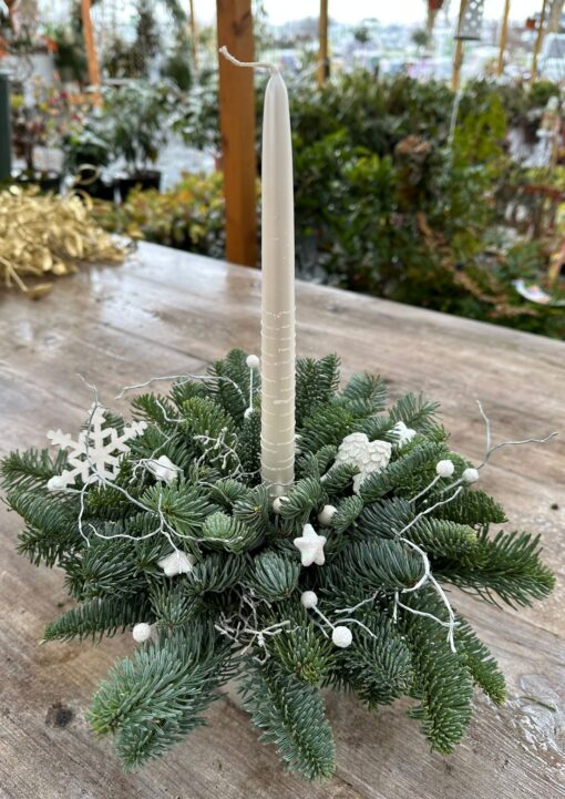 Bílý svícen s jedlovými větvičkami.Zdoben  malými přízdobami.