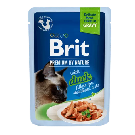 Varianty příchutí respektují přirozené preference koček i jejich nutriční potřeby z hlediska fáze věku či speciální výživy. Delikátní šťáva podtrhuje chuť masových kousků a dodá kočce potřebné tekutiny.Brit Premium filety s kachnou ve šťávě pro kastrované kočky