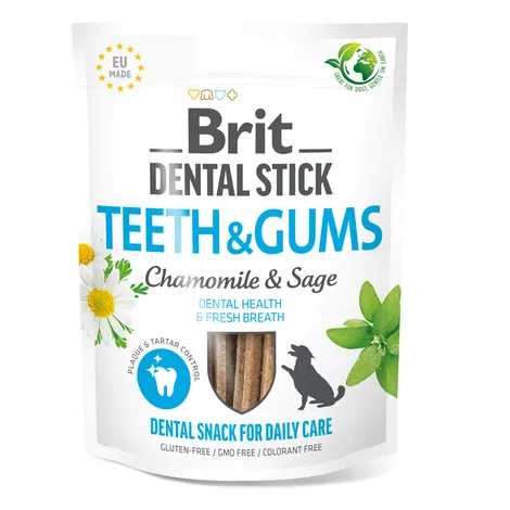 Doplňkové krmivo Brit Care Dog Dental Stick Teeth & Gums - mechanicky čistí zuby, osvěžuje dech a přispívá ke zdravým dásním. Bez lepku, GMO a barviv. 7 tyčinek v balení.