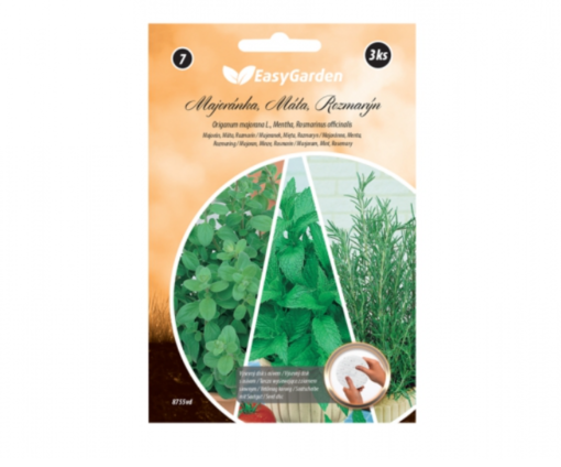 Připravená směs má optimální počet semen a předurčenou vzdálenost mezi semínky, rostliny tak není potřeba následně jednotit či protrhávat. Semena mají vysokou klíčivost a pouze potřebné množství. V balení jsou 3 disky - 3 druhy bylinek - majoránka, máta a rozmarýn. Průměr disku: 8 cm.