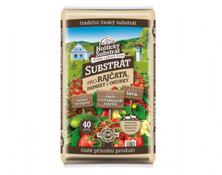 Substrát pro rajčata, papriky a okurky je vyroben ze směsi vytříděné světlé a tmavé rašeliny, kvalitního vytříděného zeleného kompostu, lávy a organických hnojiv obsahujících všechny hlavní živiny i stopové prvky. Substrát neobsahuje minerální (průmyslová) hnojiva. Půdní reakce je upravena jemně mletým dolomitickým vápencem. Je ve formě mikrogranulátu, což zaručuje mnohem efektivnějšího rozmístění hnojiva v substrátu. Díky tomu je zajištěn rovnoměrný růst rostlin a tvorba kořenového systému. Přítomnost lávy má příznivý vliv na provzdušnění substrátu, čímž se zvyšuje přístup vzduchu ke kořenům rostlin. To příznivě ovlivňuje zakořeňování rostlin i rozvoj kořenového systému. Obsahuje potřebné množství základních i stopových živin. Balení: 40 l.