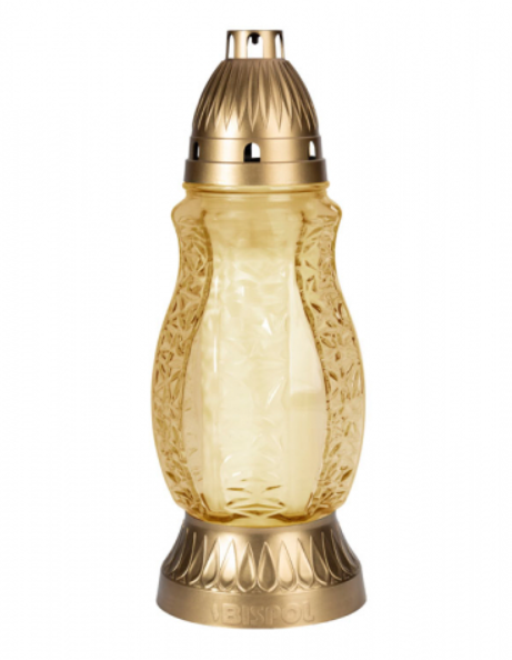 Skleněná hřbitovní lampa se zlatým plastovým víčkem. Lampa je ozdobena drobnými květinami. Barva: béžová. Průměr: 11 cm, výška: 30 cm. Hmotnost: 260 g.