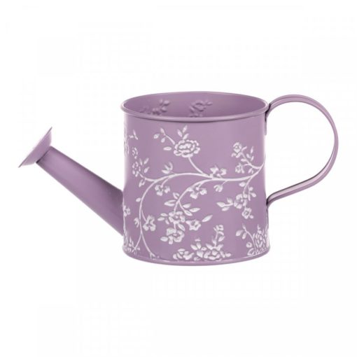 Kovový obal na květiny KK054 LILA ve tvaru konve v světle fialové barvě s bílými růžemi.