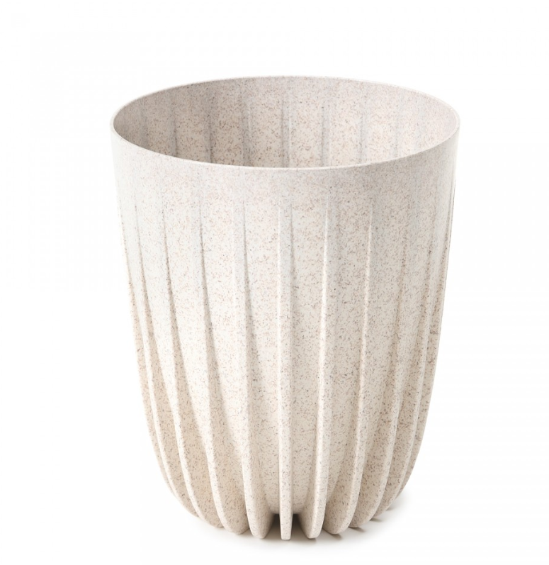 Plastový květináč z kolekce Mira eco wood. Moderní vysoký květináč s žebrováním. Součástí květináče je černý plastový vklad sloužící k odtoku přebytečné vody pod tento vklad.