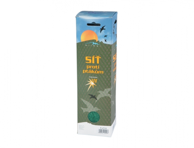 Síťovina na ochranu bobulovin, peckovin, jahod, vinné révy a jiných plodin před napadením ptactvem. Vyrobena s polyetylenové síťky. Po sklizni je možno síť sejmout a znovu použít Barva: zelená. Rozměry: 5 x 5 m.