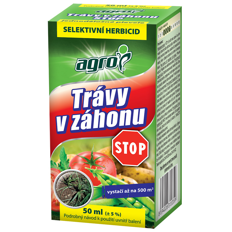 AGRO Trávy v záhonu STOP je selektivní přípravek k hubení jednoděložných (trávovitých) plevelů a pýru plazivého. Působí systémově. Jeho použití je vhodné na rajčata, brambory, hrách aj.