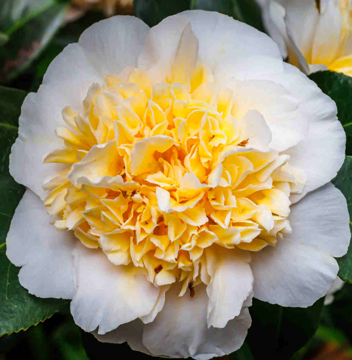 Kamélie japonská 'Brushfield's Yellow' je naprosto unikátní a vyhledávaný kultivar. Je proslulá svými dvoubarevnými květy, které vnášejí do zahrad a zimních zahrad nádech exotiky. Střed květu je hustě vyplněn krémově žlutými okvětními lístky, které jsou obklopeny prstencem čistě bílých větších lístků. Rostlina je dodávána v kontejneru o objemu 5 litrů při výšce 60–80 cm.