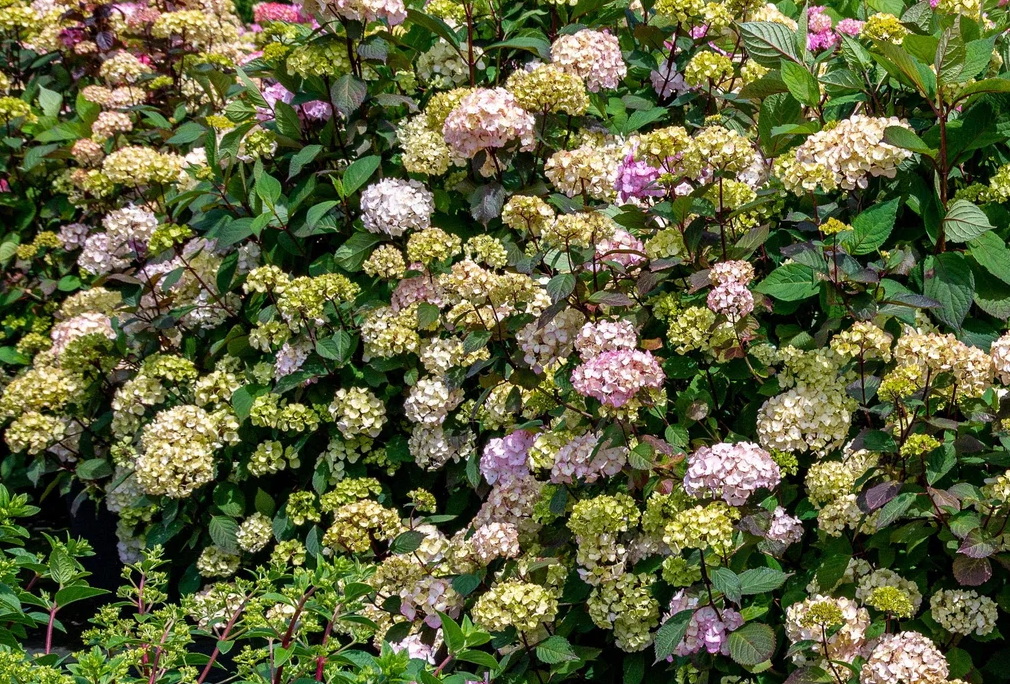 • Květy: Polokulovitá až kulovitá květenství. Rozkvétají zpočátku žlutozeleně až bledě růžově, postupně tmavnou do sytě růžové a na podzim získávají sytě karmínově červenou barvu