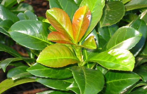 Listy: Kožovité, vejčité, lesklé; mladé listy bronzové, starší tmavě zelené