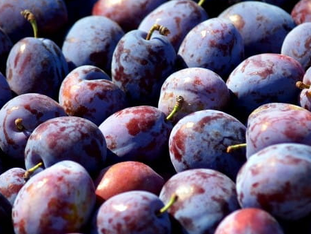 Plody: Velké až velmi velké (35–50 g), vejčitého tvaru; slupka je narůžověle fialová až modrá s výrazným světle modrým ojíněním. Dužina je žlutozelená, pevná, šťavnatá, sladce navinulá a velmi dobře odlučitelná od pecky