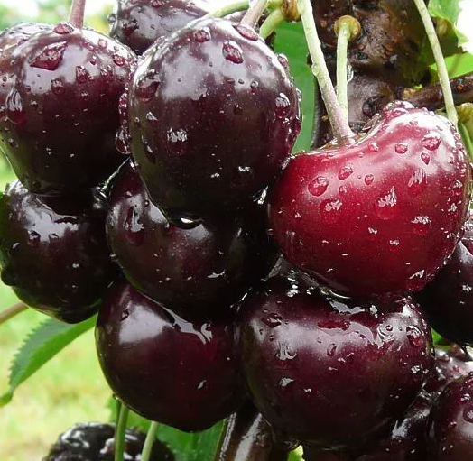 Plody: Velké, široce srdčité; slupka je lesklá, sytě tmavě červená. Dužina je tuhá (typická chrupka), šťavnatá a velmi chutná, harmonicky sladká