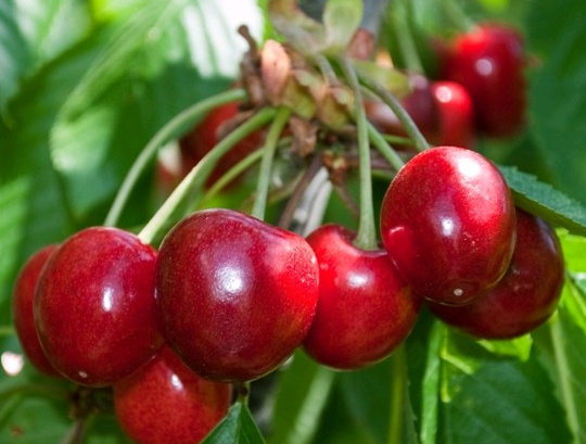 Plody: Velké, kulovité až mírně srdčité; slupka je lesklá, tmavě karmínově červená. Dužina je středně tuhá, šťavnatá, výborné nasládlé chuti